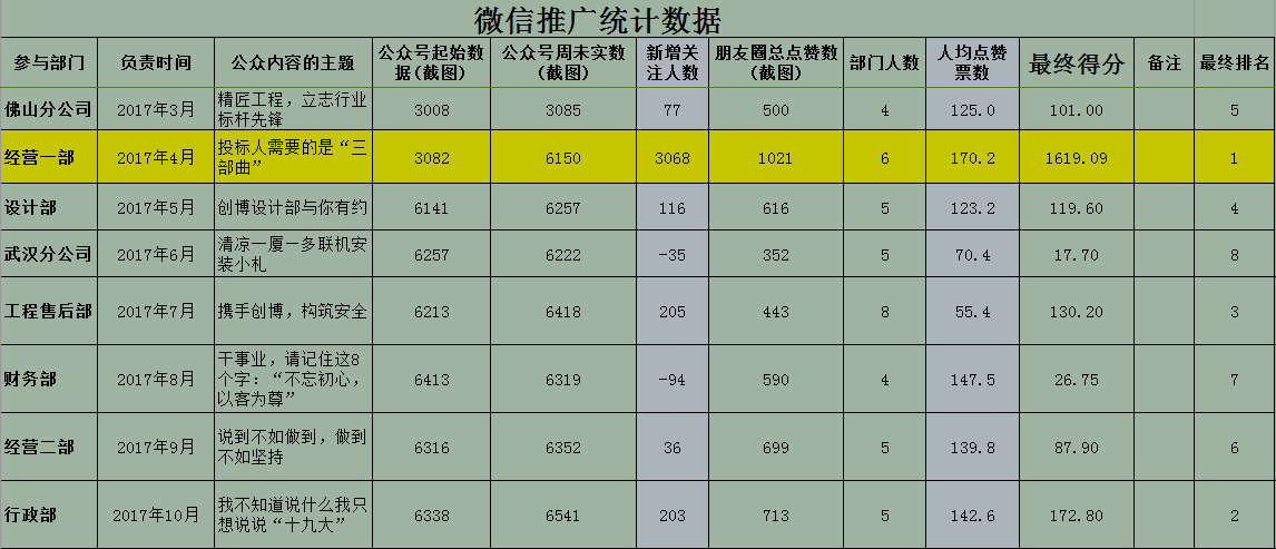 2017年11月10日在公司會(huì)議室,舉辦了公司公眾微信推廣活動(dòng)的頒獎(jiǎng)活動(dòng)。本次活動(dòng)規(guī)則是由每部門在公司微信公眾號發(fā)表一篇文章,在一個(gè)月的時(shí)間里,統(tǒng)計(jì)本部門人員微信朋友圈文章點(diǎn)贊量以及公司微信公眾號的新增關(guān)注量。排名由點(diǎn)贊數(shù)及關(guān)注量決定,排名第一的部門將獲得2000.00現(xiàn)金獎(jiǎng)勵(lì)。以下為各部門排名數(shù)據(jù)統(tǒng)計(jì):